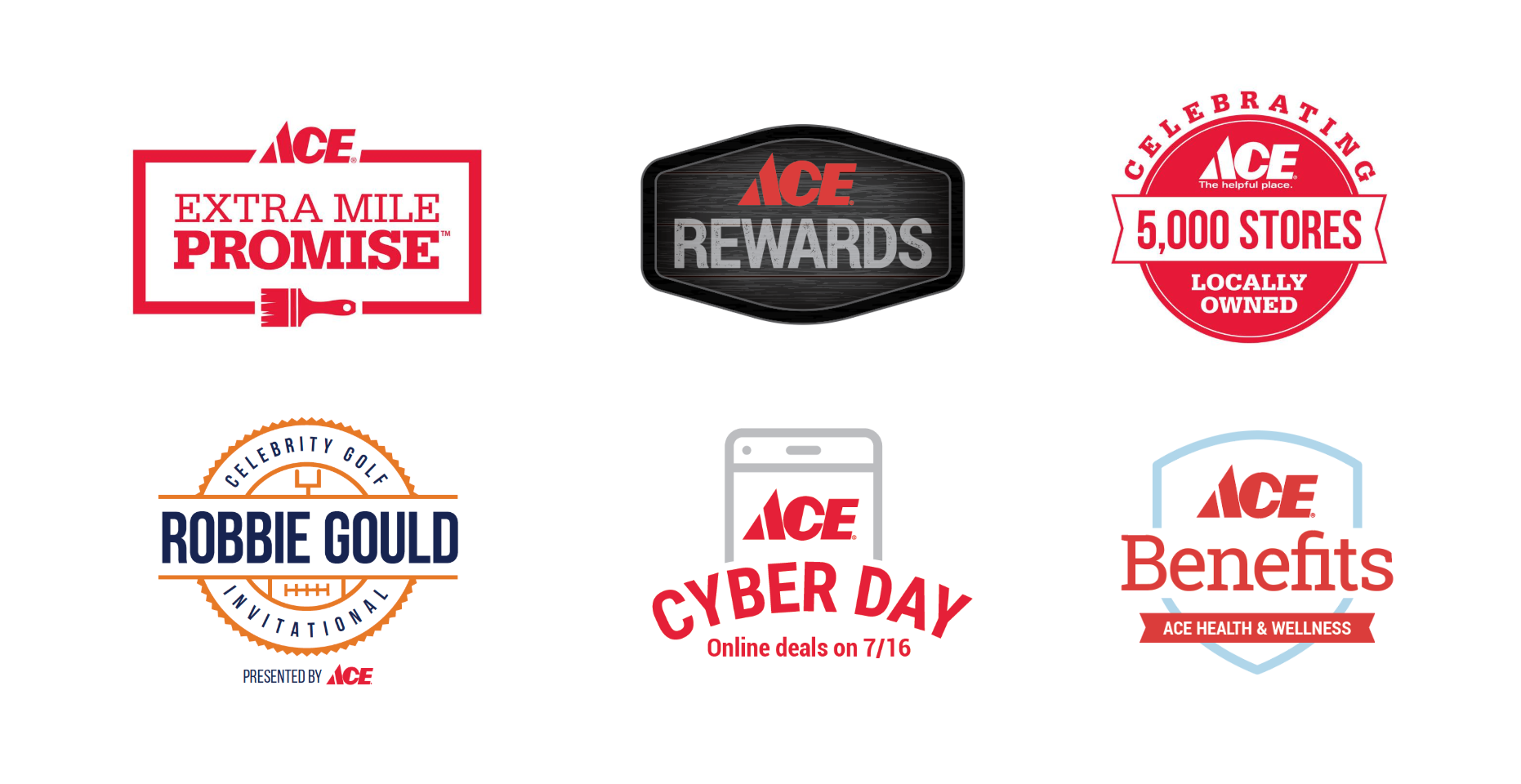 A sampling of various Ace Hardware program logos, from consumer-facing Extra Mile Promise, Cyber Day and Ace Rewards to internal Ace Benefits. Creative direction and design.