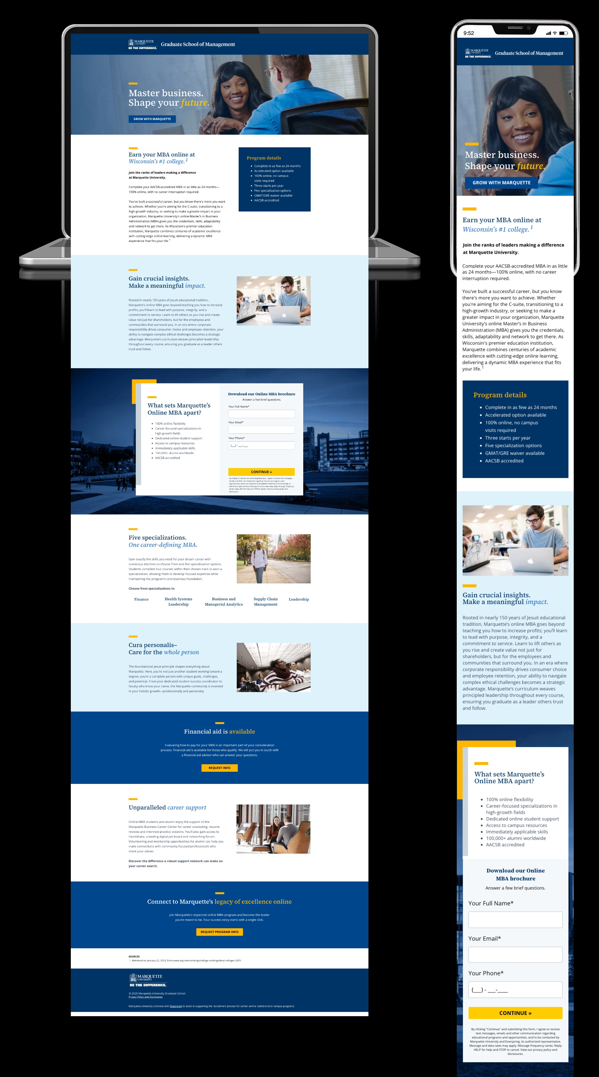 Landing page for Marquette University online MBA program. Built in Instapage, this is the click-though destination for paid search and paid social ads.