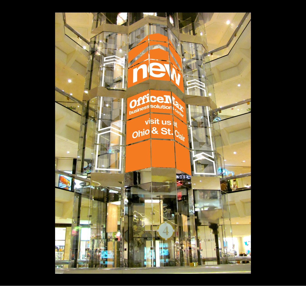 Elevator wrap inside Chicago's iconic Water Tower Place, promoting the opening of a new OfficeMax location downtown. Concept, design and production.