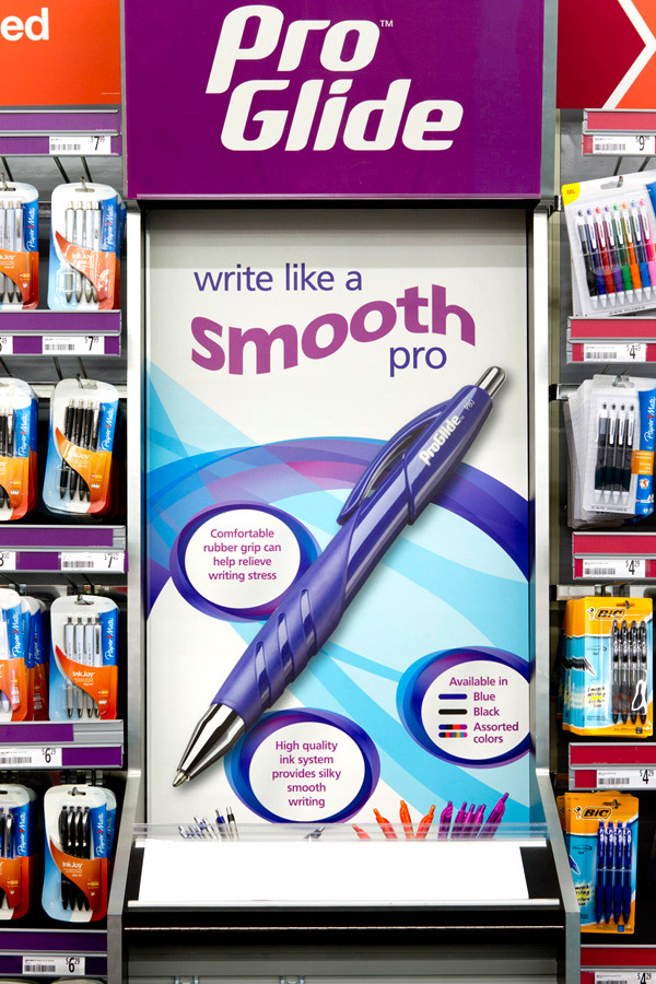 Retail store display for OfficeMax private brand ProGlide. This pen display allows shoppers to test writing utensils while communicating brand attributes. Concepting and design.