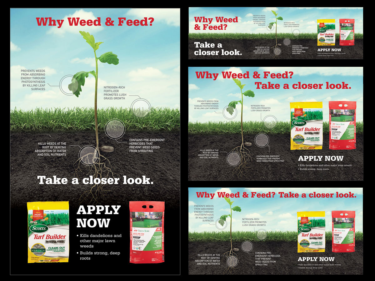 In-store marketing campaign for Scotts Turf Builder at Ace Hardware. The POS strategy to educate consumers on the benefits of "weed and feed" included posters, counter mats, banners and end caps. Concepting and design.