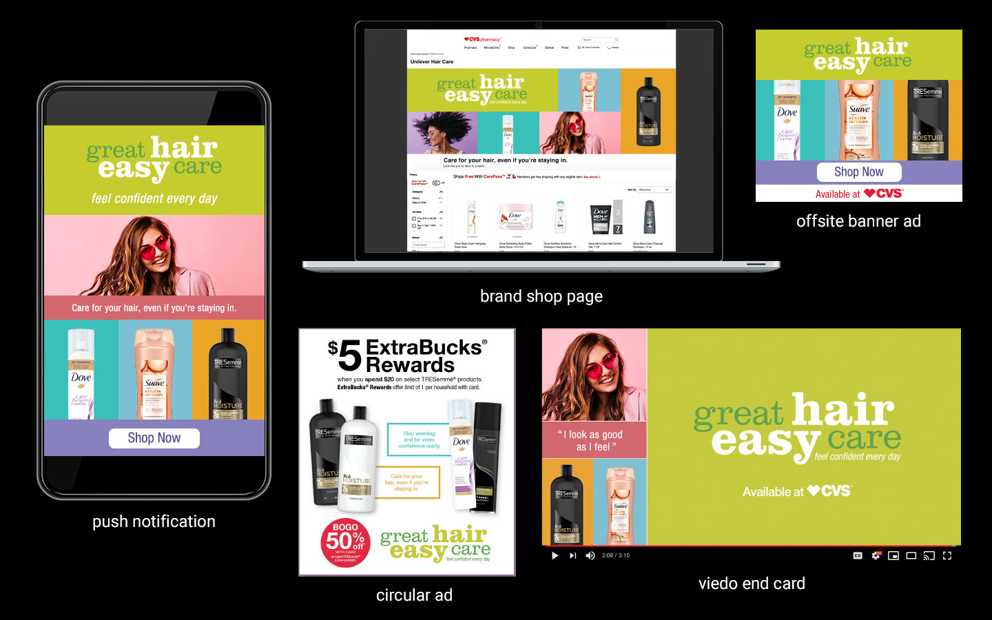 Omnichannel platform to promote Unilever hair care products at CVS. This was a client-chosen concept that earned national tactic executions in both digital and print media. Creative driection.