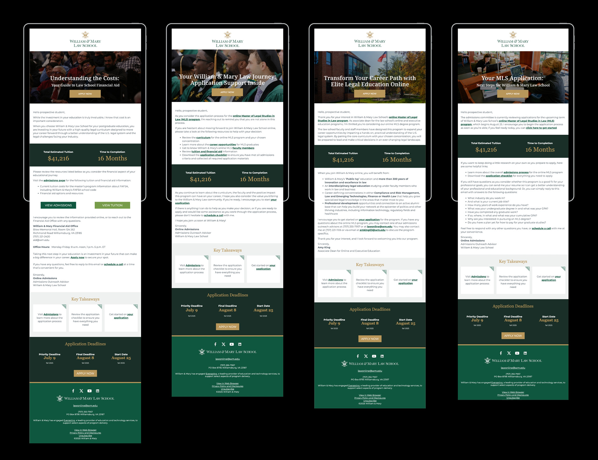 Email series promoting the online MLS program for the William & Mary Law School. These emails were sent to leads generated by the website and landing pages, serving as a lower-funnel, drive-to-apply tactic.