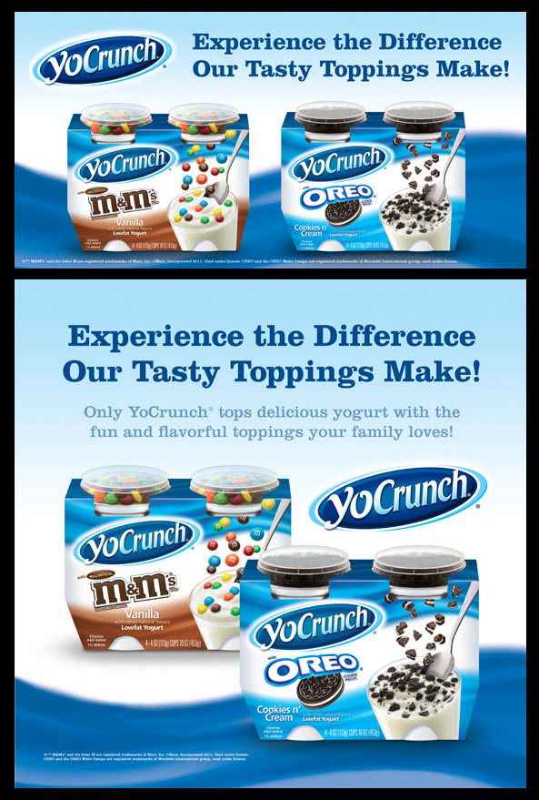 Superfridge display header card and poster design for YoCrunch. These POP elements are applied to an in-store refrigerator that holds YoCrunch products. Concepting and design.